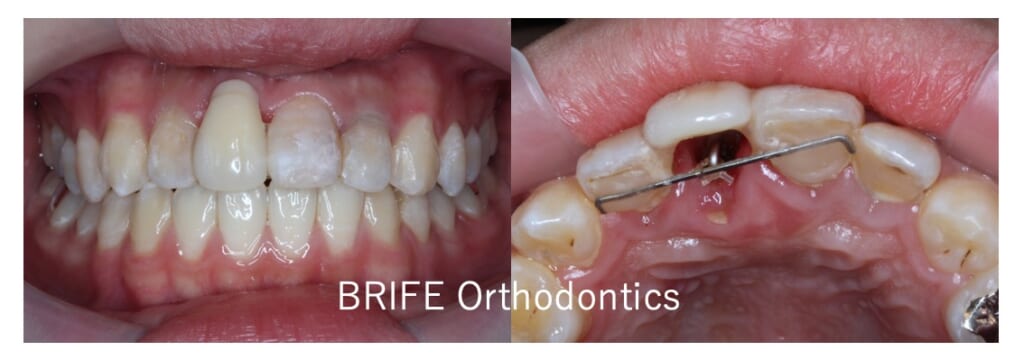 折れてしまった歯の左右の歯を土台にして、少しづつ(数ヶ月)引っ張り出していきます。
