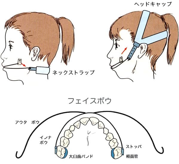 例えば上顎の歯並びが前方にずれてしまっている場合には、先ほど説明させていただいた「ヘッドギア」を、上の奥歯を後方に移動させる目的で使用します。