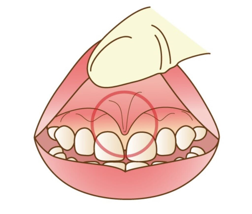 「上の前歯」に注意して磨きましょう。この時上唇小帯に歯ブラシが当たると痛がります。指で優しくスジをガードし磨くようにします。