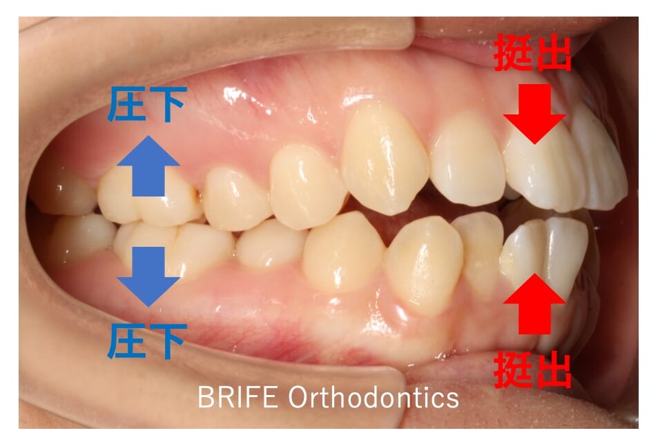 臼歯の圧下を行うべきか、前歯の挺出を行うべきか、もしくはその両方か、は症例により異なります。