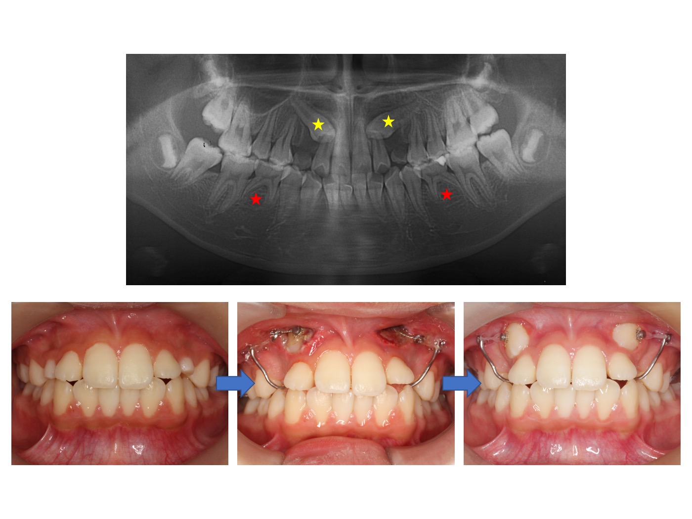 初診時において、上のレントゲン画像の黄色い星で示した上顎の犬歯が生えておらず、両側ともに著しく傾斜している状況でした。