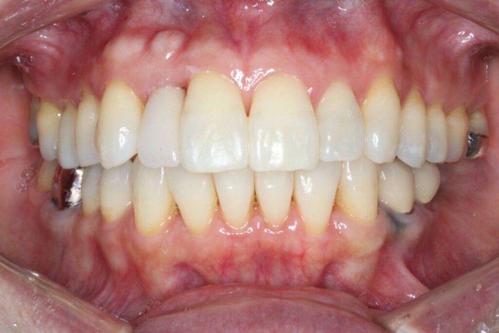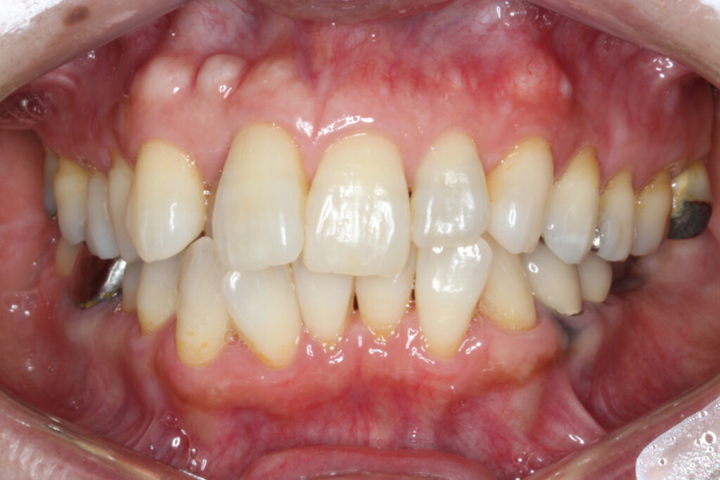 上顎、下顎ともに前歯にがたつきがあり、右上の2番目の歯は反対咬合になっています。