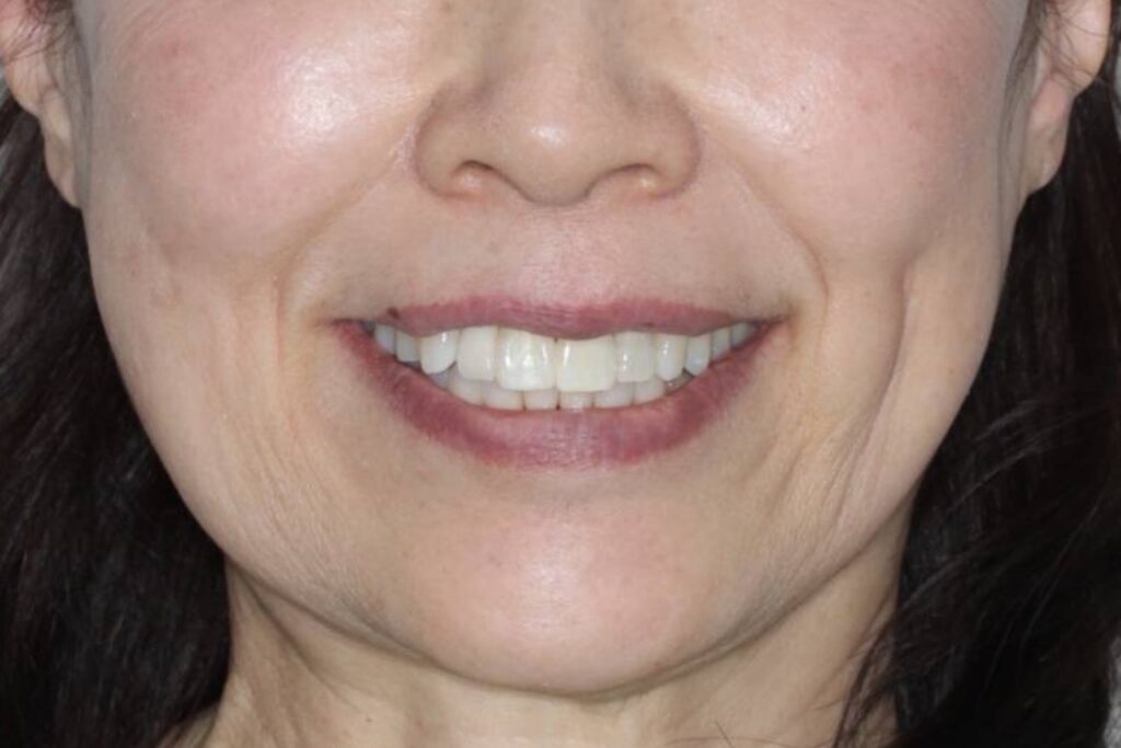 矯正治療の後に、右上の2番目の歯は色が暗く目立ってしまうため、被せる治療を別途行うことで非常に良好な印象の歯並びとなりました。