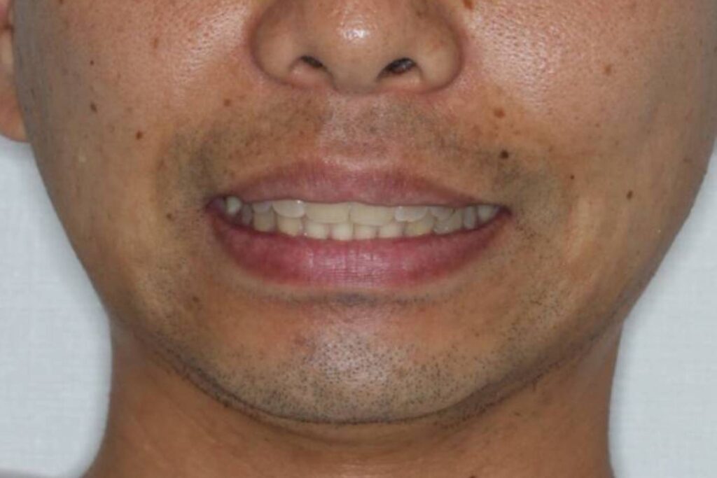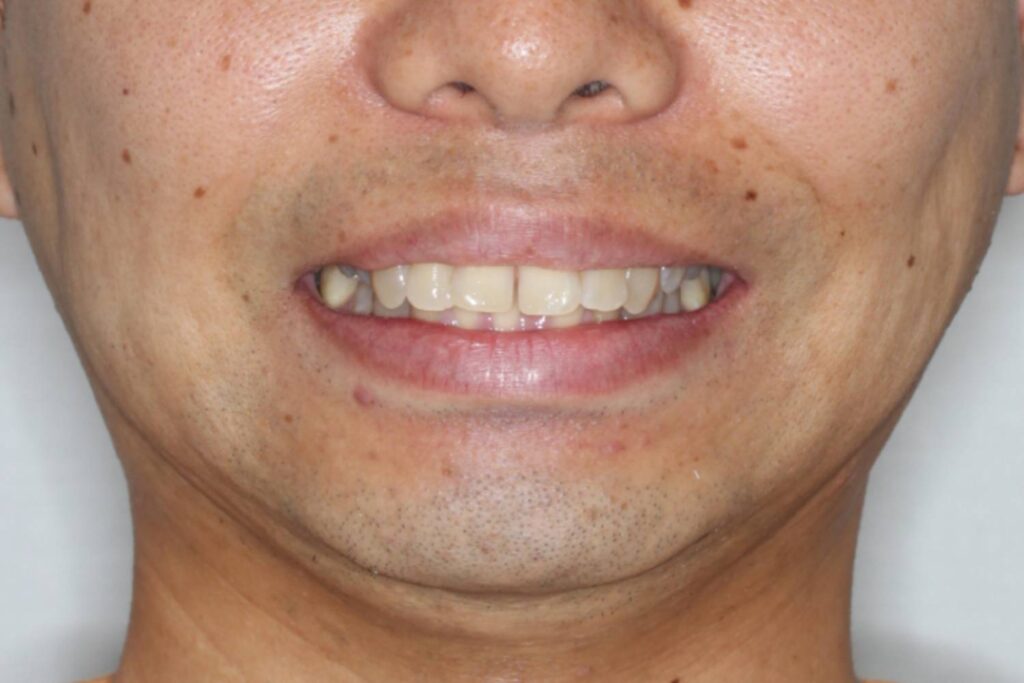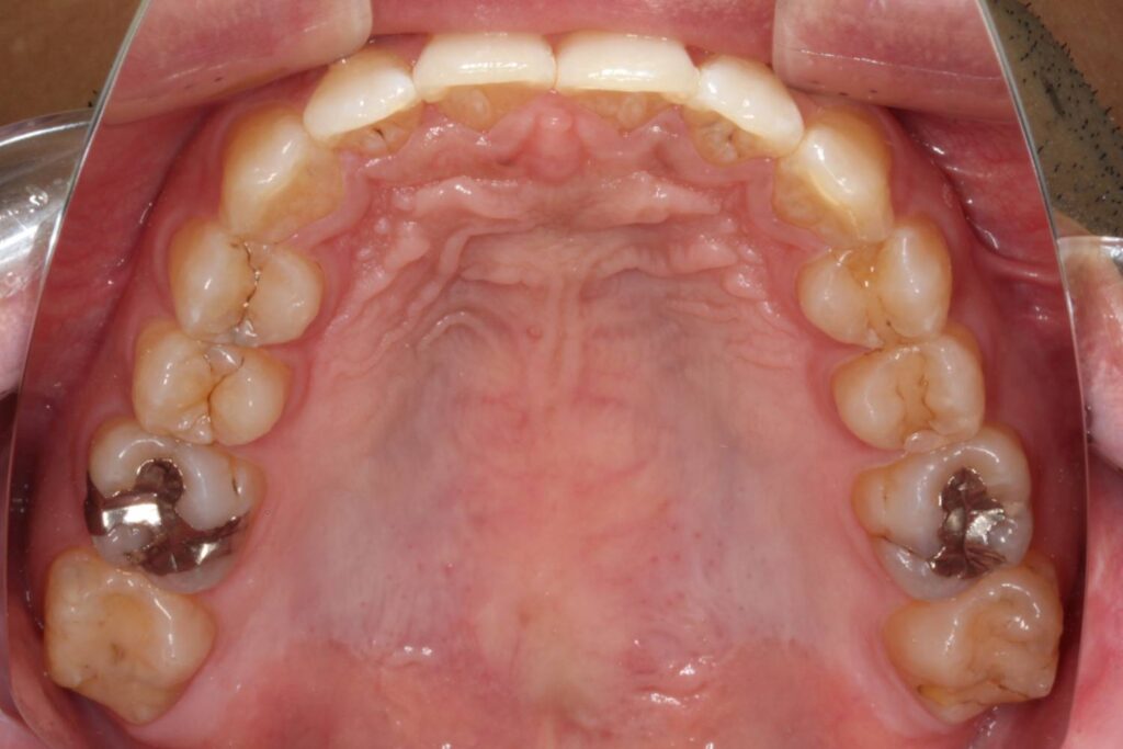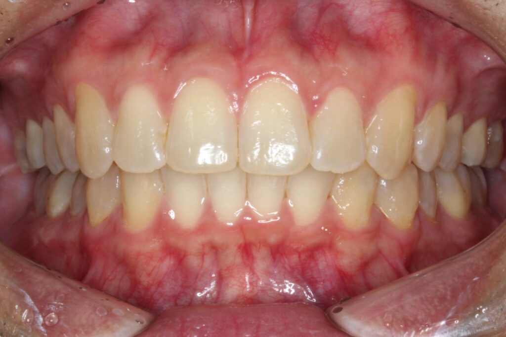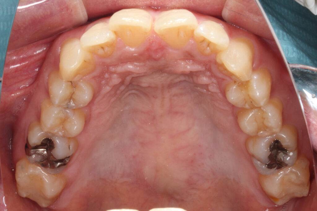 上顎の歯並び全体を後方へ引っ込めつつ、前歯のサイズ調整を行いました。