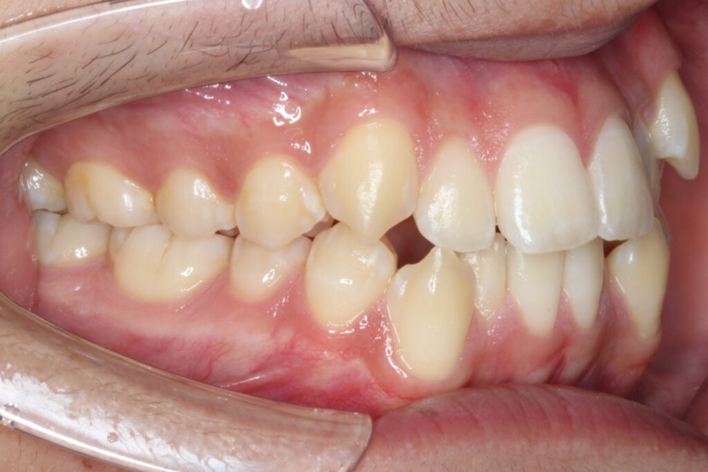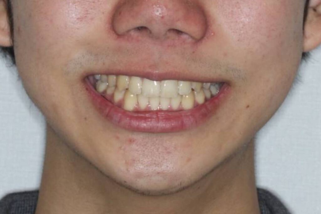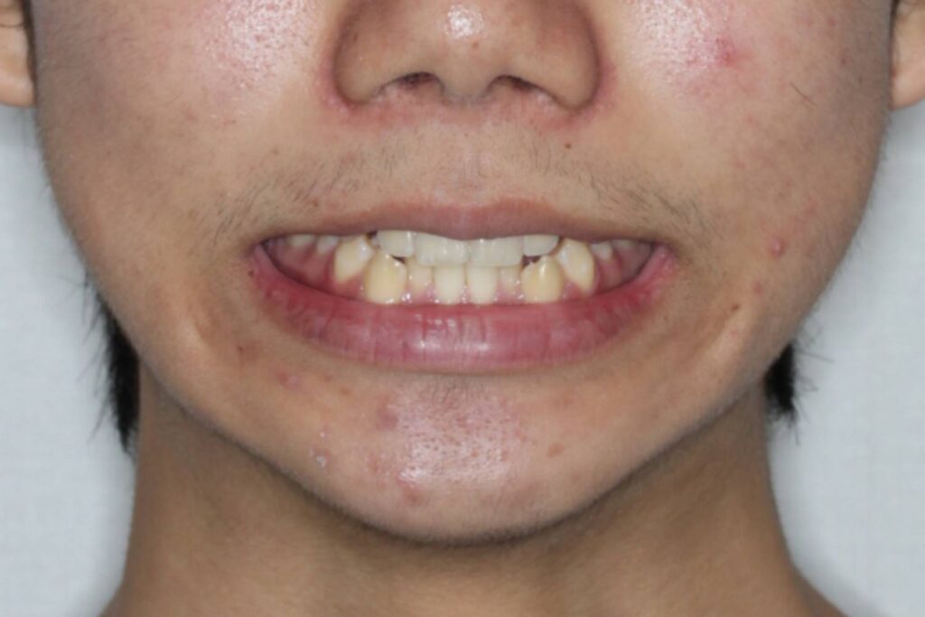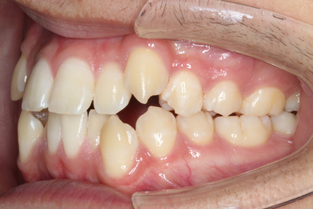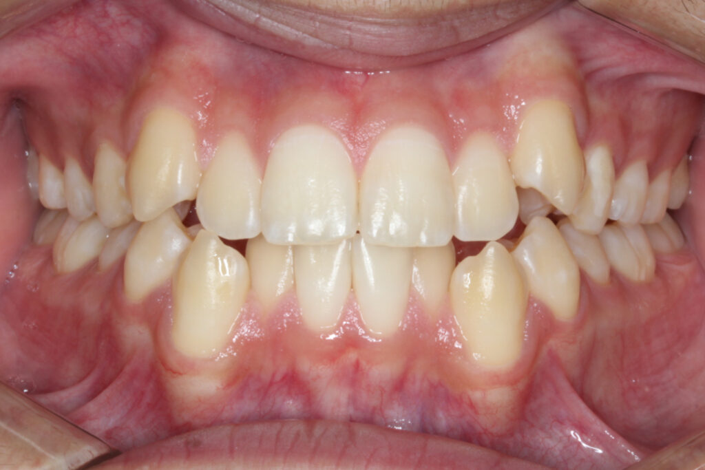 上下顎の前歯にがたつきがあり、犬歯は外側へ飛び出て噛み合わない位置になっています。