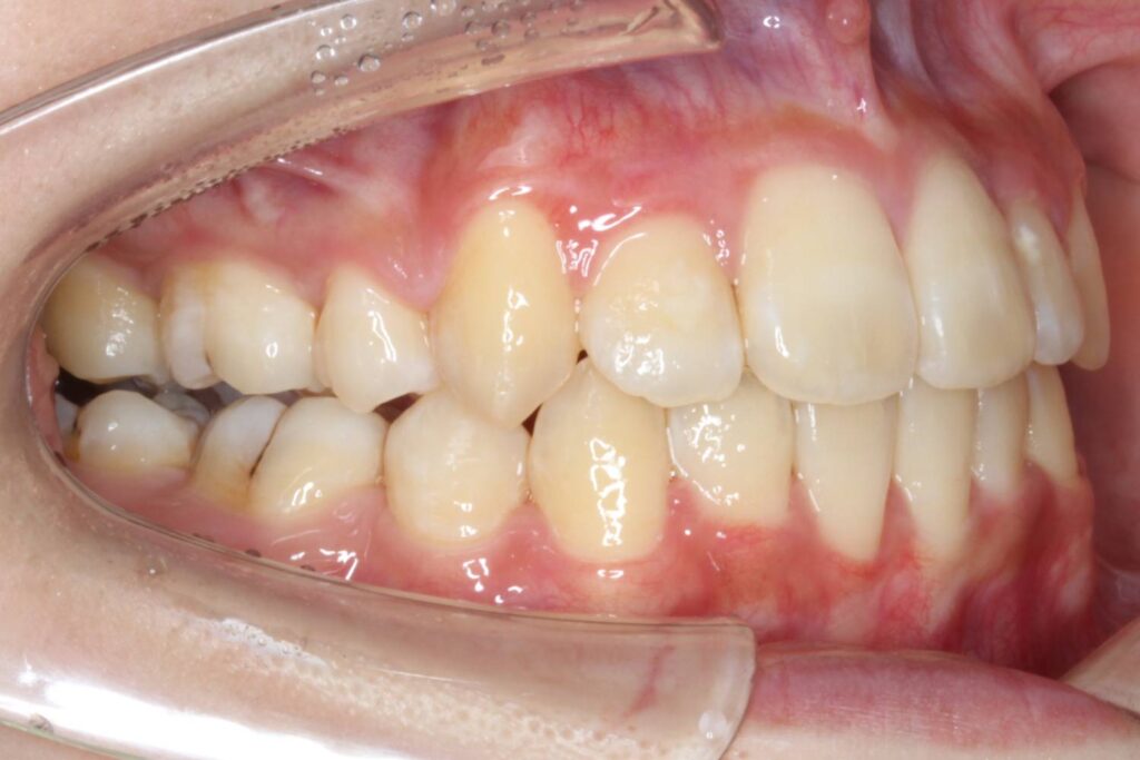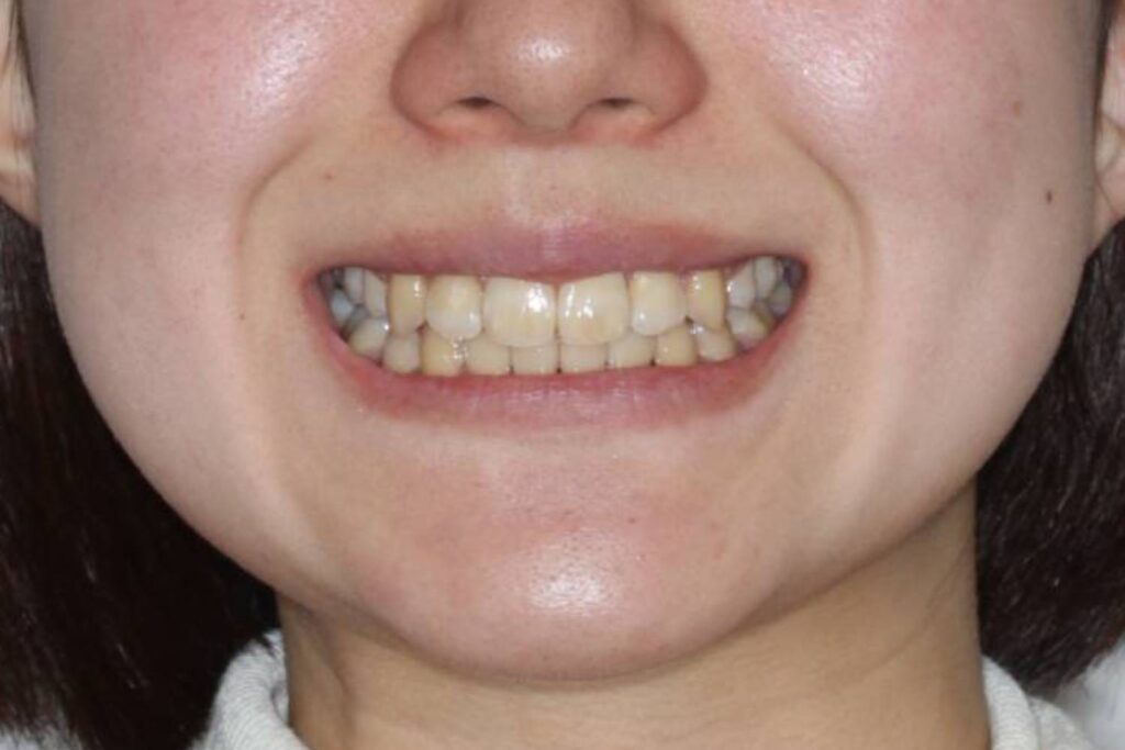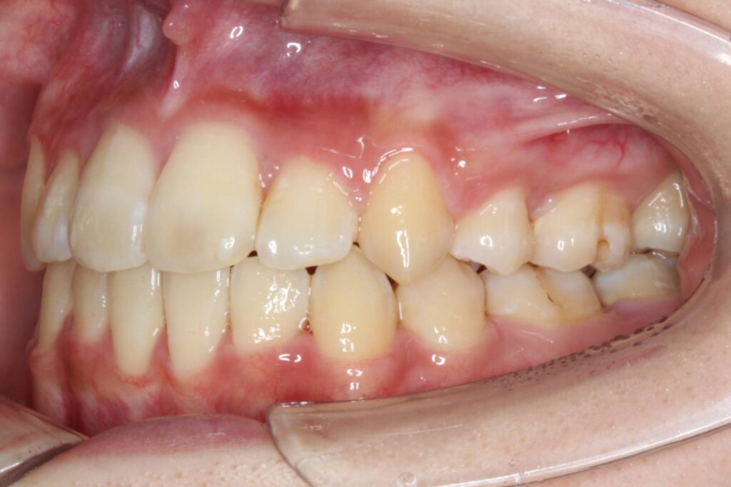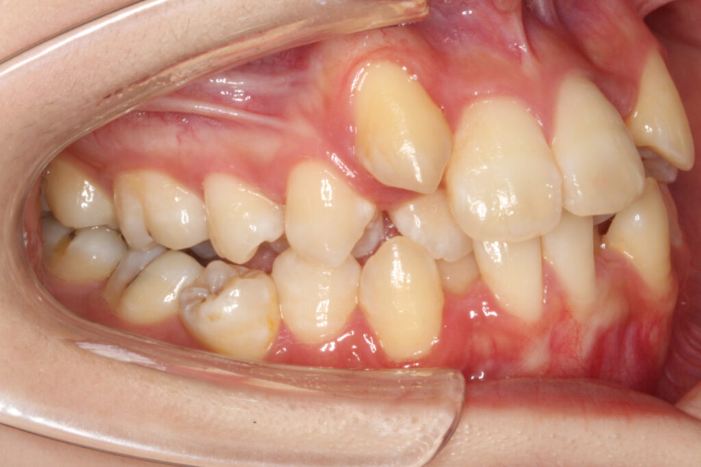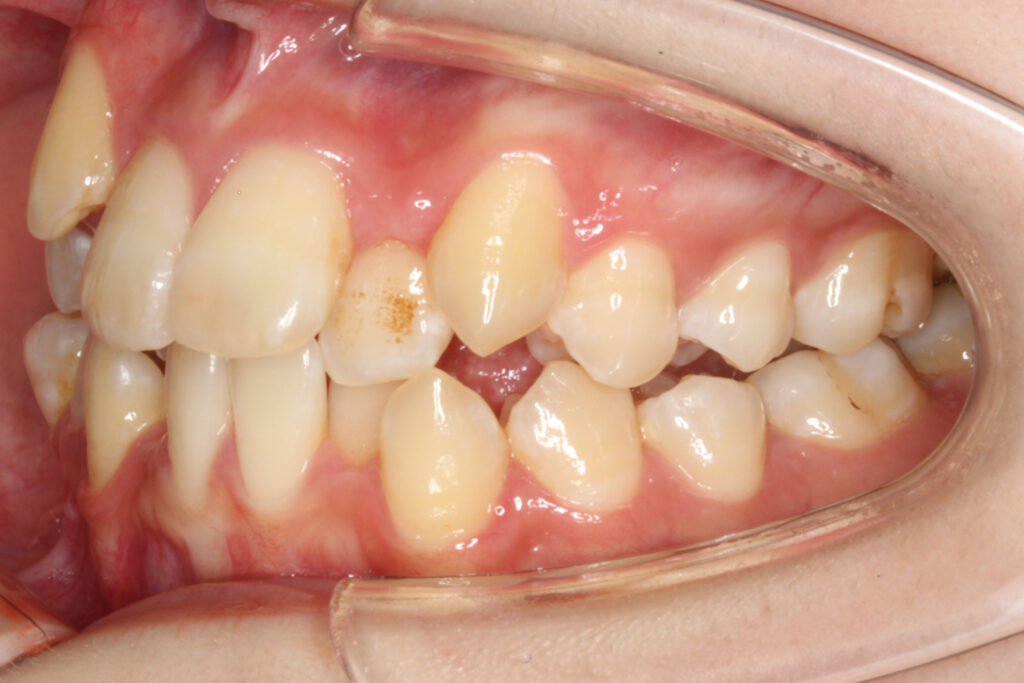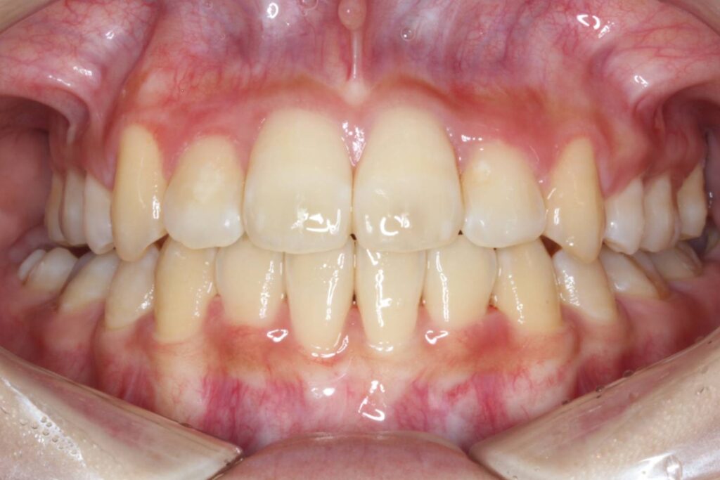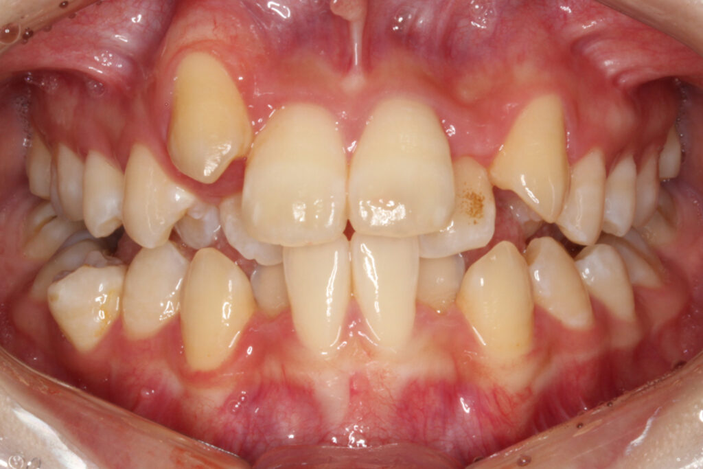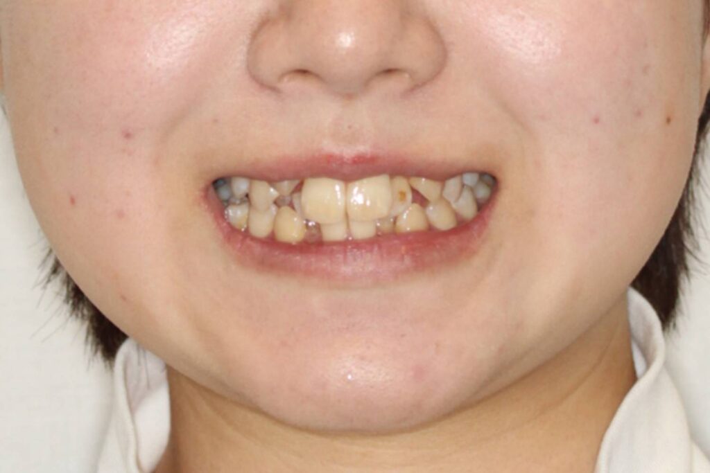 上下顎の前歯にがたつきがあり、左右の2番目の歯は反対咬合になっています。