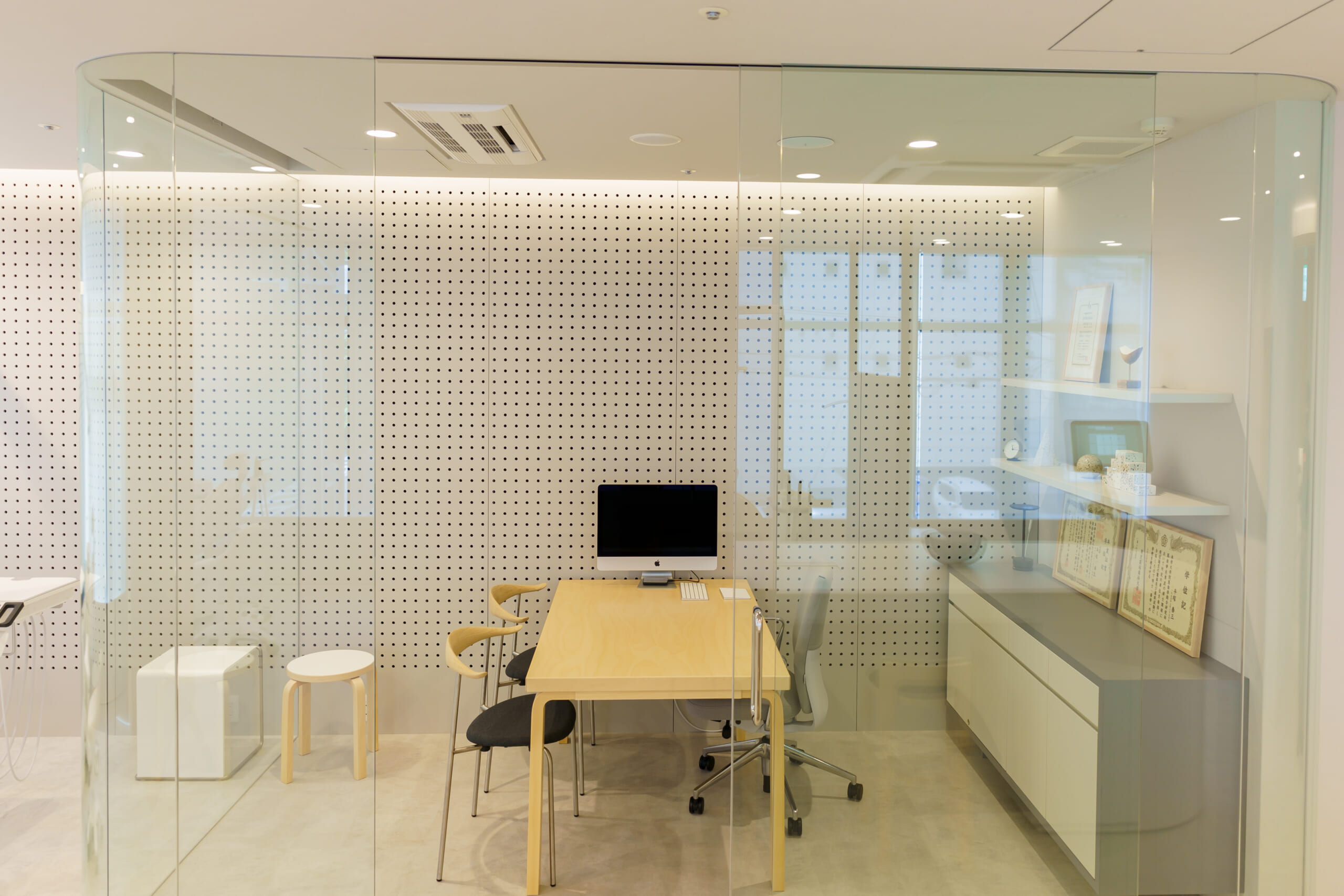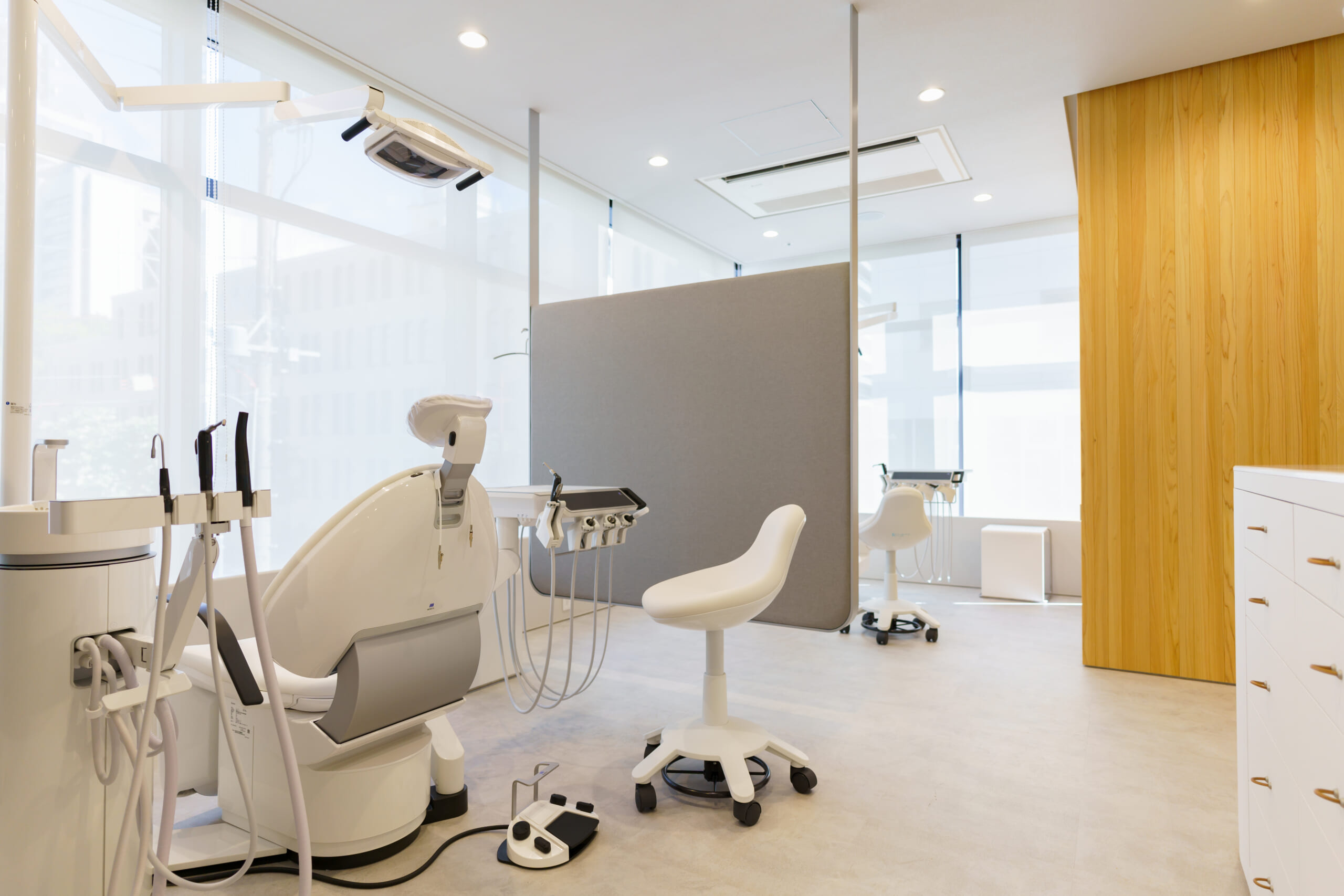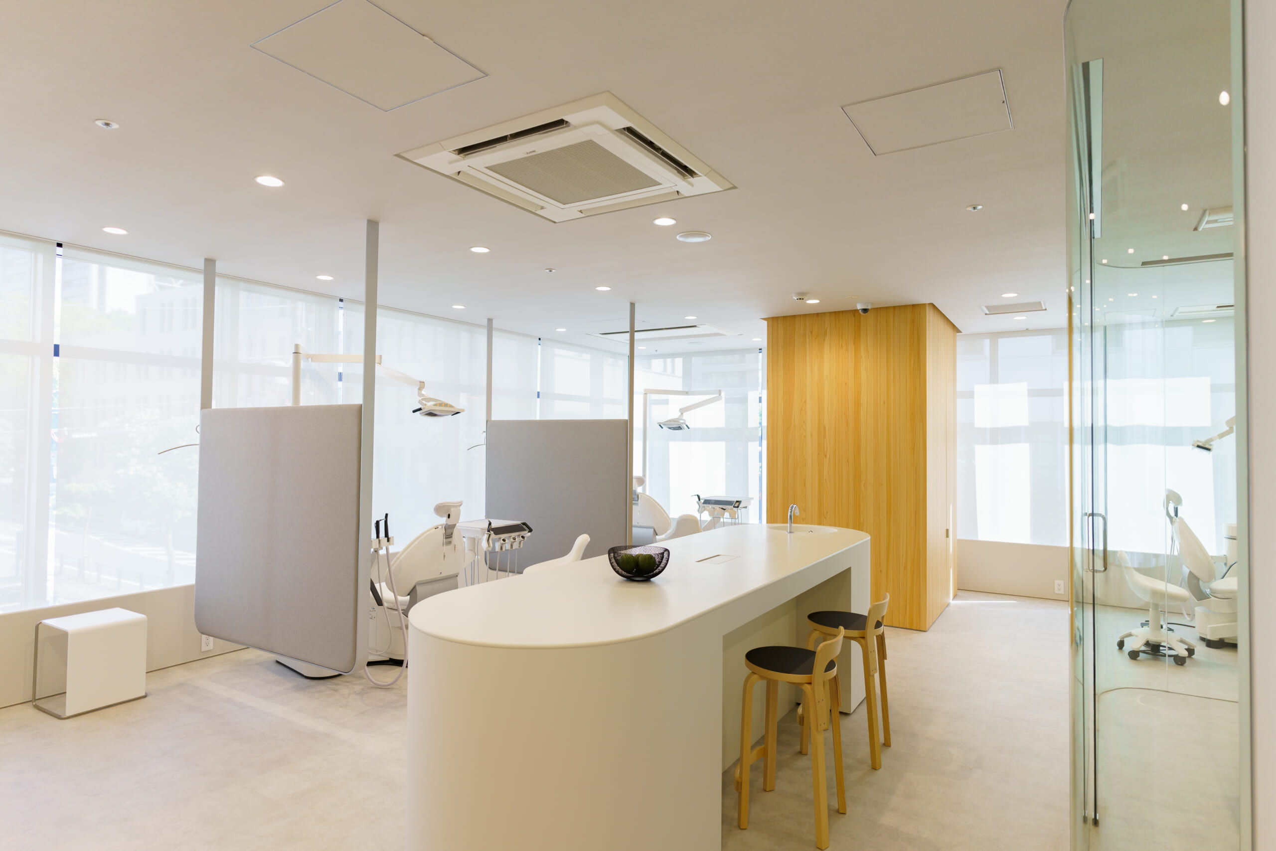 ガラス面が広く、明るく開放的な診療室となっております。診療中も気持ちよくお過ごしいただけるよう設計いたしました。
