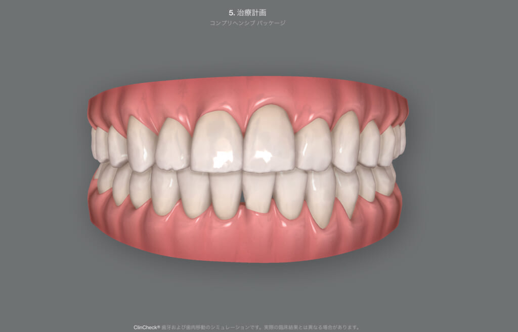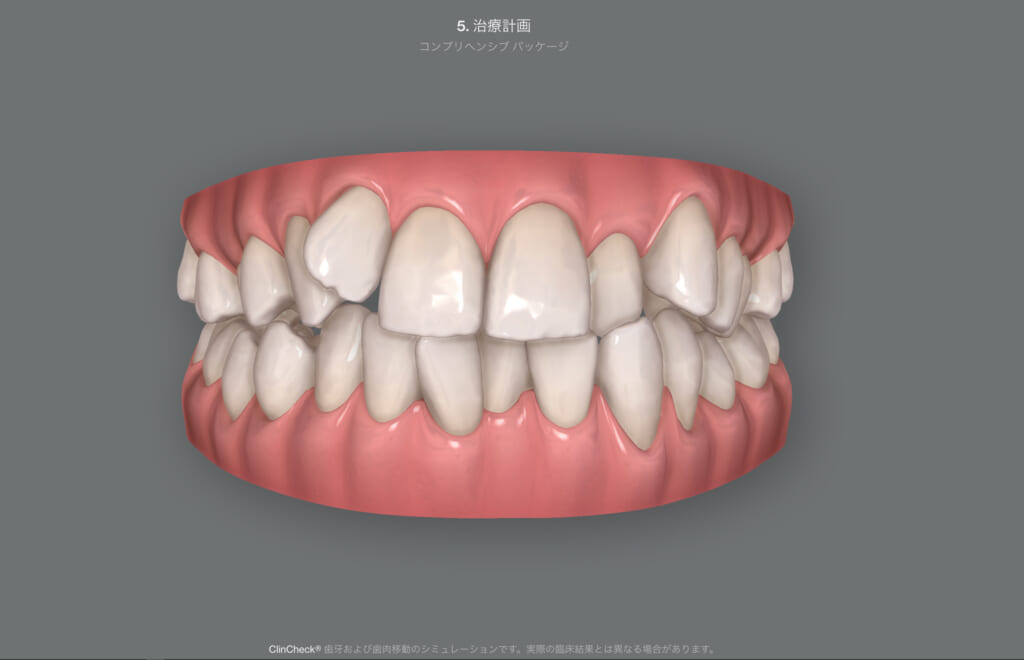 ●治療期間が明確にわかる ・・・クリンチェックによるシミュレーションを行うことで、治療完了までに必要なマウスピースの枚数が決まりますので、トータルの治療期間がわかります。就職活動や成人式、結婚式など大切なご予定がある場合にも、矯正治療が終わっているのか、歯並びがどの程度治っているのか、などを治療開始前に確認することができます。 |